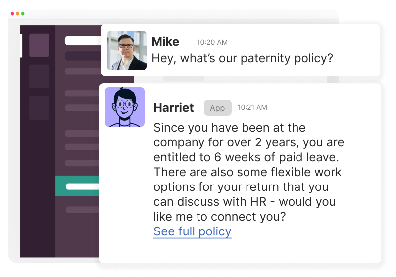 Harriet integrates with your company's Lattice account. Whenever your team asks a question, she can pull accurate information straight from the systems you already use.